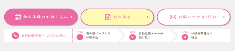 無料体験、資料請求、お問い合わせとボタンがありますが、知名度がないと、無料体験に来てくれる人が少なかったりするのでとにかく、問い合わせに誘導するようにしましょう。